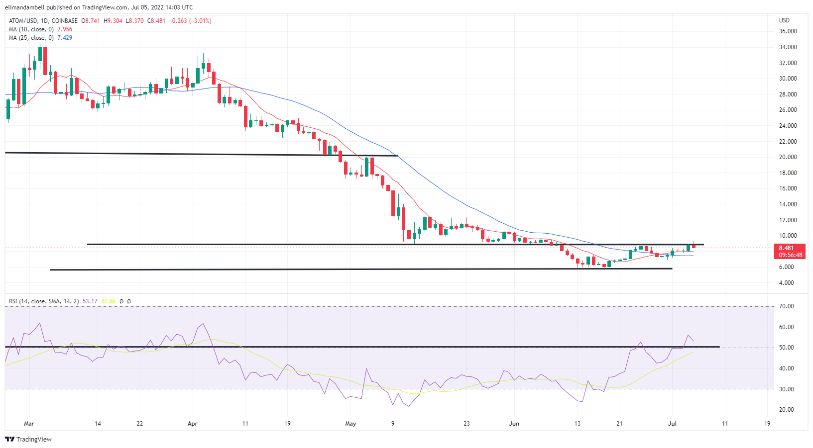 Today’s peak sees ATOM/USD hit its highest point since June 9, as prices made their way down below the $10 mark.