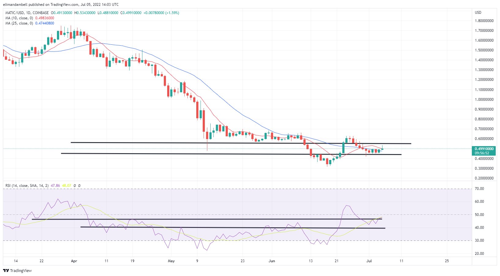 This is the highest point MATIC/USD has reached since June 29, and comes as the $0.4375 support point has stabilized.