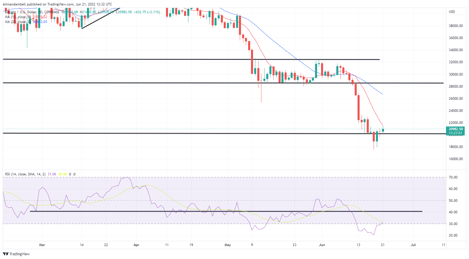 Prices hit an intraday peak of $21,387.65 earlier in today’s session, less than a day after trading at a low of $19,905.48.