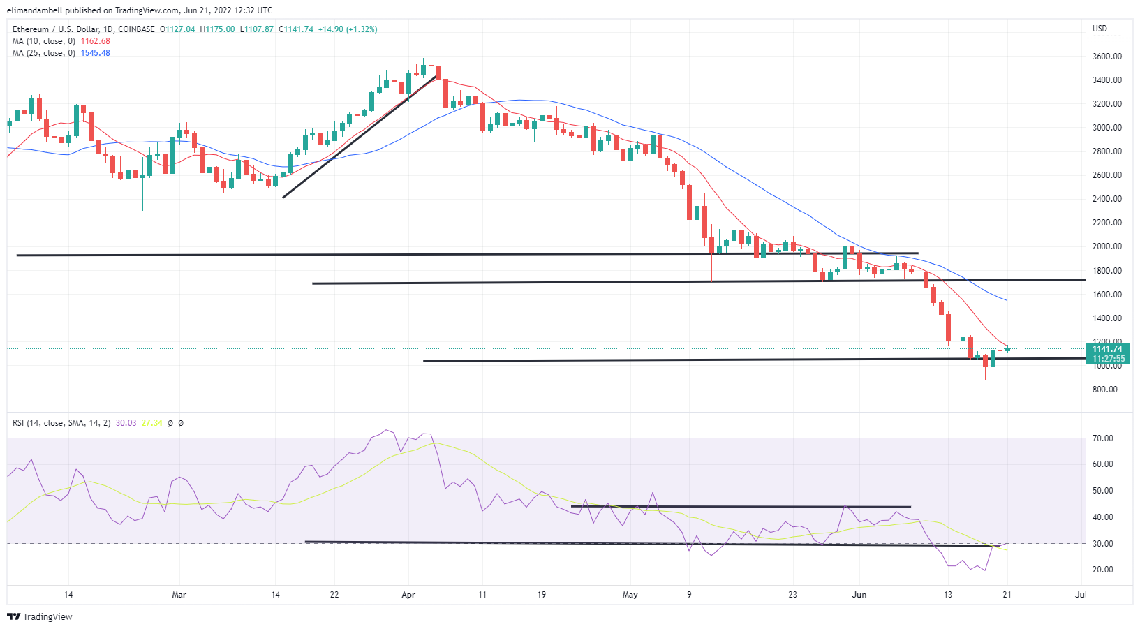 Tuesday’s peak is almost $300 higher than last weekend’s lows, which saw ETH trade close to $850 for the first time since January 2021.